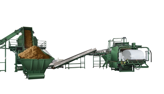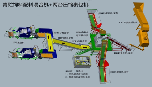 青貯飼料稱重配料→攪拌混合→自動進(jìn)料→壓縮成捆→預(yù)包膜→物料輸送→最終包膜→成品輸出