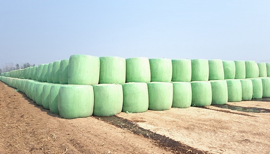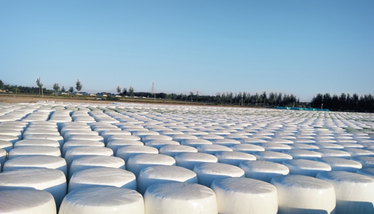 將收割粉碎的飼草料(莧草,玉米秸稈)和麥麩分別投入料倉即可實現(xiàn)智能、自動化混料?;炝贤瓿珊?,通過智能程序控制系統(tǒng),可一鍵操作壓縮、打包、包膜等程序,快速將粉碎的飼草料變成成品草包。草料被壓實裹包后,處于密實、低氧的狀態(tài)下。經(jīng)過1—2個月時間,就可發(fā)酵獲得優(yōu)質(zhì)的飼料,可露天存放2-3年。